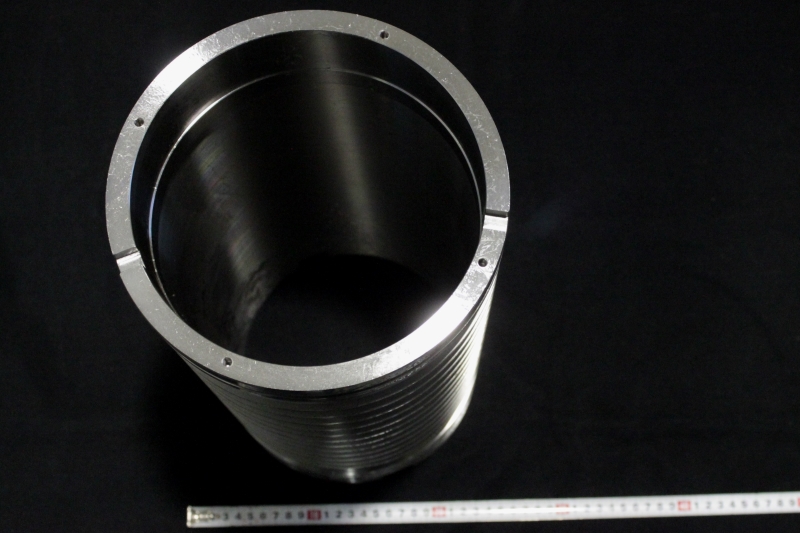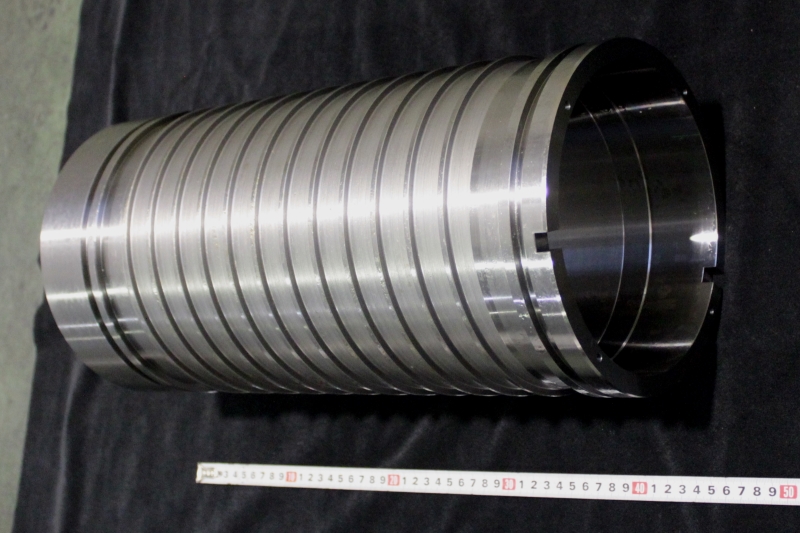 素材:S45C(パイプ材) 寸法:外径φ205mm、全長423mm、厚み12mm 薄肉+長い為、ジグ+オリジナルボーイングバイト製作+研磨仕上げ ポイント:内径347mm部仕上げ、外径角ネジ切り